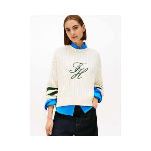 Tommy Hilfiger women's sweater. Soft and durable, this cable knit sweater is made from fine-gauge combed cotton that keeps its shape and resists pilling. The embroidered logo and varsity stripes add a sporty yet elevated vibe.