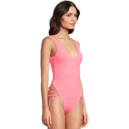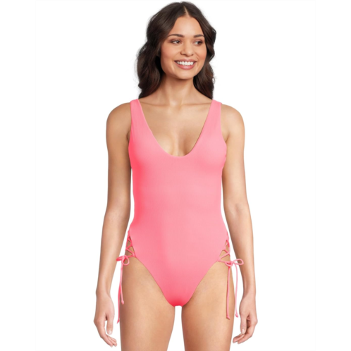 Beach more and worry less wearing the BECCA Modern Edge Rib Sophie Lace Up One Piece. This swimsuit features plunge neckline, rib texture fabrication, tank silhouette, scoop neckline, removable cups, drop shelf bra, lace-up cut-out sides, lace-up back detail, moderate coverage, fully lined, pull-on construction.