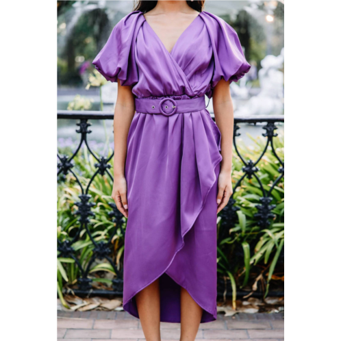 Just add slides or mules and you are good to go.Introducing the Puff Sleeve Satin Dress by Entro, an exquisite piece perfect for your evening events this spring. This dress features short bubble sleeves and a sophisticated V-neckline, with a flattering A-line midi silhouette that measures 47 inches in length. Made from 100% polyester satin in a striking purple hue, it boasts a wrap style with a belted waist, and showcases pleated shoulders for added elegance. Care for this fully lined, non-sheer dress with hand wash methods and line dry to maintain its quiet luxury essence.