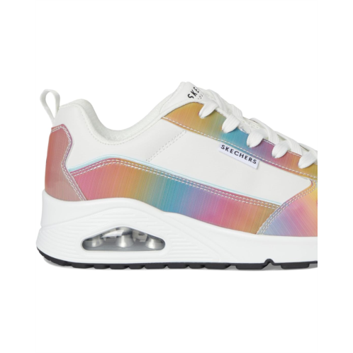 Stand out with vibrant style wearing the SKECHERS Uno - Opalescent shoes. These lace-up fashion sneakers feature a lenticular polyurethane upper and Skech-Air visible air-cushioned midsole, making them a comfortable footwear choice. They are crafted with a polyester lining and Skechers Air-Cooled Memory Foam comfort insole.