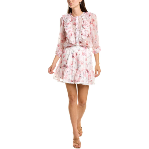 Introducing the Beulah 2pc Top & Mini Skirt Set, designed to empower women through fashion. This stunning set in pink features semi-sheer foil-printed fabric, ruffle trim, elasticized cuffs, and a smocked waist skirt with a ruffle lace hem. The top measures approximately 24.5 inches from shoulder to hem, while the skirt has an inseam of approximately 18 inches. With a button front and slip-on styling, this set is easy to wear and style. Made from 100% polyester, it is machine washable and imported for your convenience. The model is 5'11 and is wearing a size small. Please note that measurements may vary slightly by size. Elevate your wardrobe with the Beulah 2pc Top & Mini Skirt Set and stand out in style!