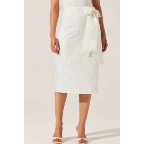 The midi length skirt is here to stay and we especially love this style.Introducing the Jazmine Skirt by ASTR, an elegant addition to your wardrobe in a stunning white hue. This feminine pencil skirt, featuring a delicate lace design, falls to a sophisticated midi length, perfect for special occasions or professional settings. Composition - 100% Polyester. Closure - Zip closure. Country of Origin - Imported. Care - Dry clean. Model is 5'9' and is wearing a size small, ensuring a true-to-size fit.