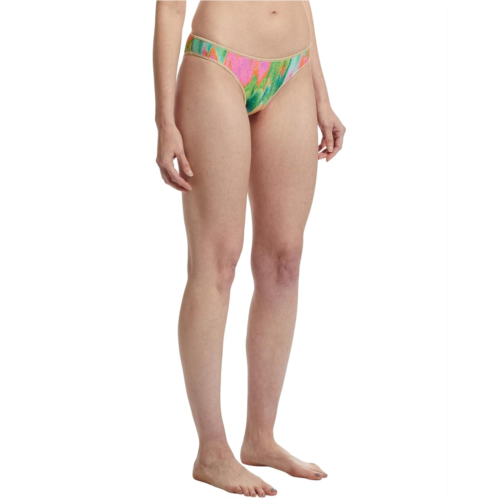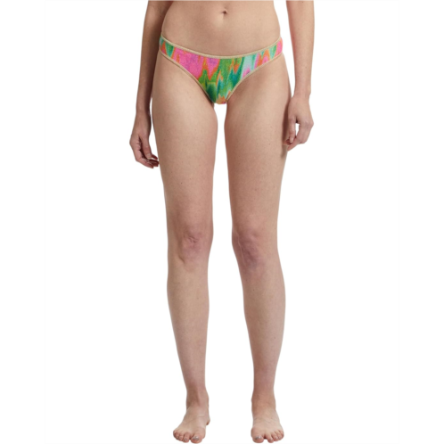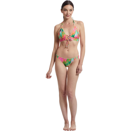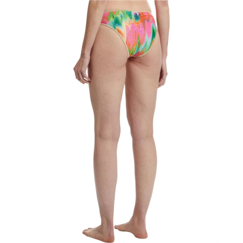Make your next pool sessions more comfortable and fun wearing BECCA Mirage Adela Hipster Bottom in silver metallic fabric. The pull-on style bottoms feature a shirred back, natural threaded edge stitch, a tropical allover print, and a regular cut.