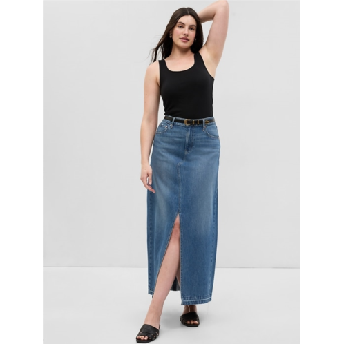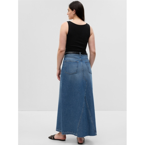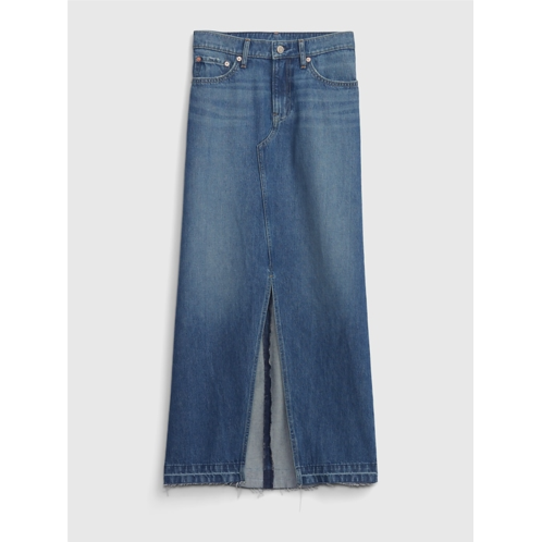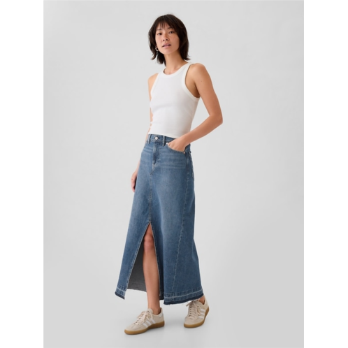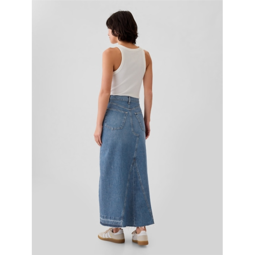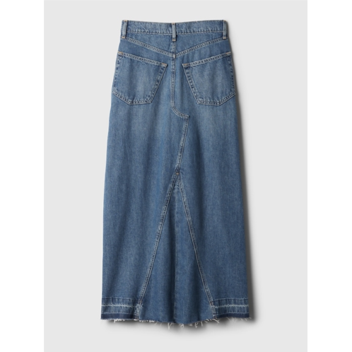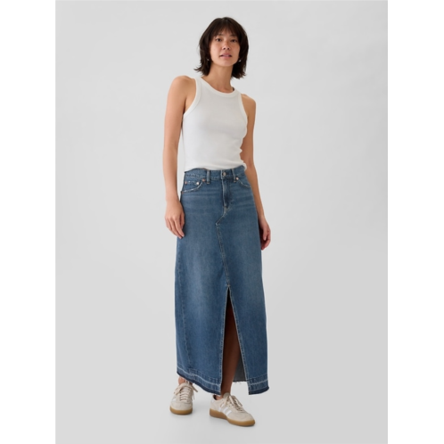 -Look:A five-pocket denim skirt in a medium indigo wash. Let down hem.