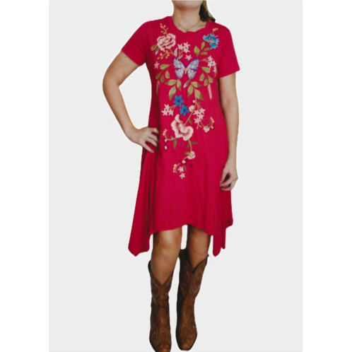 Casual, comfortable and cute! The dress that you'll be reaching for all season long.Graceful and eye-catching, Handkerchief Knit Dress - Nicolette features a stunning floral and butterfly motif across the bodice, creating a beautifully balanced design. The soft, flowy fabric moves with ease, while the handkerchief hem adds a touch of flair and movement. It is styled with short sleeves and a crew neckline. Equal parts comfy and captivating, this embroidered dress is perfect for garden parties, weekend getaways, or whenever you want to feel effortlessly adorable. Model is 5'1' and wearing a size Medium. Machine Wash.