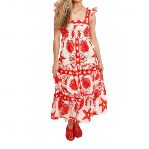Embrace the vibrant spirit of summer with theIsla Ruffle Sleeve Tiered Midi DressbyMoon River. Showcasing playful red and white graphic patterns, this sleeveless dress features charming ruffle sleeves and a breezy tiered silhouette that exudes effortless Boho Chic style. Designed with a comfortable pull-on fit and a soft lining, it’s perfect for warm-weather outings or relaxed gatherings.