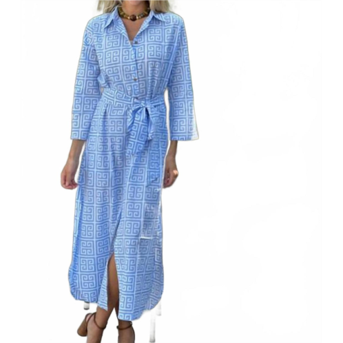 A midi dress so versatile, your options for wearing it are endless.Introducing the Dar Midi Dress by Just Darviny, a standout piece in Greek Key French Blue perfect for any occasion. This women’s sheath silhouette features three-quarter sleeves and a classic collar, accentuated with a full-length button front and a matching belt for added flair. Crafted from 100% cotton, the dress measures 53 inches in length and offers comfortable, chic style with versatility. Closure - Button closure. Care - Machine wash cold on a delicate cycle, line dry.