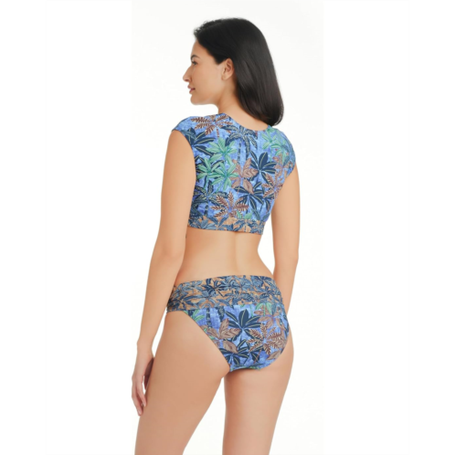 Slay a stylish look by wearing the Bleu Rod Beattie By the Sea Tie Front Cap Sleeve Top. The pull-on style top features a deep V-neckline with a tie at the front, cap sleeves, removable soft cups, and banded under the bust for additional support. The top features intricate print allover that adds a statement touch to the look, making it a must-have in your swimwear collection.