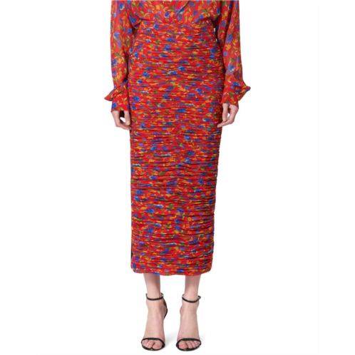Introducing the Carolina Herrera Ruched Midi Skirt, a stunning piece from the renowned brand Carolina Herrera. This elegant skirt comes in a striking lacquer red multicolor design with ruched detailing. It features a center back zipper for easy wear and measures approximately 30 inches from waist to hem. Crafted from high-quality materials, this skirt is made of 92% polyester and 8% polyurethane, with a 100% polyester combo and lining. For best care, dry clean only. Elevate your wardrobe with this sophisticated midi skirt made in the USA.