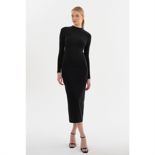 Embrace the warmth of the holidays with the MIRELLA Knit Maxi Dress. Featuring a sophisticated mock neck with a silver clasp and a striking twist-back cutout, this fitted silhouette is perfect for cozy winter evenings. Layered with your favourite coat, it's an elegant addition to any festive wardrobe.