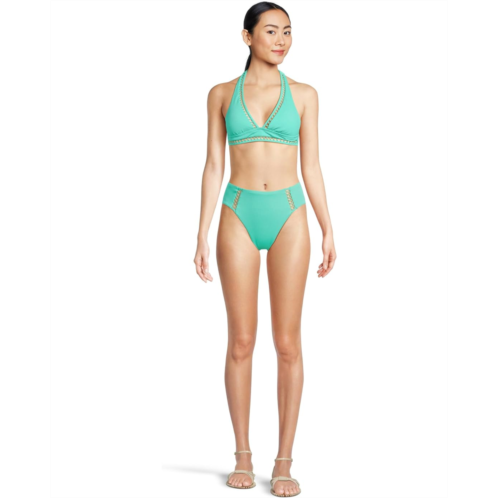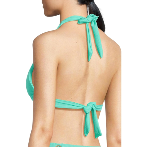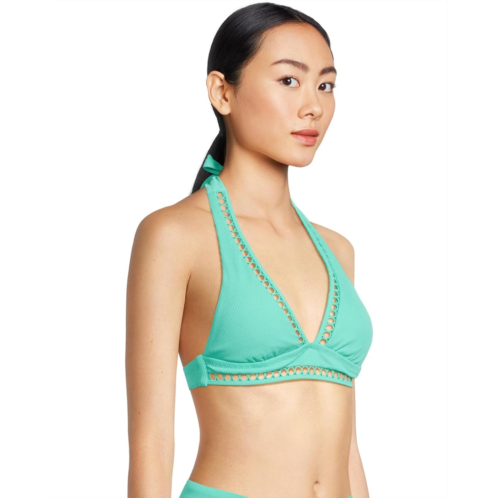 Elevate your beach-ready look in the BECCA by Rebecca Virtue Modern Edge Rib Cassidy Halter Top. Featuring cut out circle inset trim detailing, fine rib texture, removable cups, and tie closure at back and back of neck.