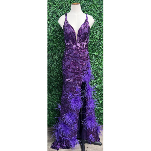 Turn heads in the cutest and most flattering evening dress.Step into the spotlight with AMARRA 88513, a stunning purple sequin prom gown designed to captivate. This exquisite dress boasts machine-embroidered sequins, featuring a dramatic feather-embellished skirt slit that moves elegantly. The gown's deep V-neckline in the front and back accentuates a graceful silhouette, while the sweeping train ensures a show-stopping entrance. Made from premium sequin and feather materials, this gown perfectly blends elegance and boldness for unforgettable events.