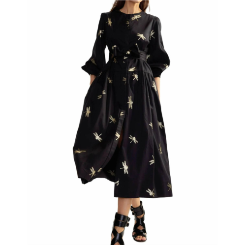 Just add slides or mules and you are good to go.Discover the Cotton Sateen Shirt Dress by Cynthia Rowley, a chic addition to any wardrobe. This midi-length piece is beautifully crafted from 100% cotton with full-length sleeves featuring elastic cuffs and a elegant A-line silhouette that measures 48 inches. Its stunning black satin finish comes alive with delicate gold foil dragonfly motifs and a gathered waistline with a removable self-tie belt for a tailored look. With button-front closure, hidden side pockets, and a scoop neckline, this dress combines style and practicality. Care is simple with options for hand wash or dry clean; just hang it to dry for best results.