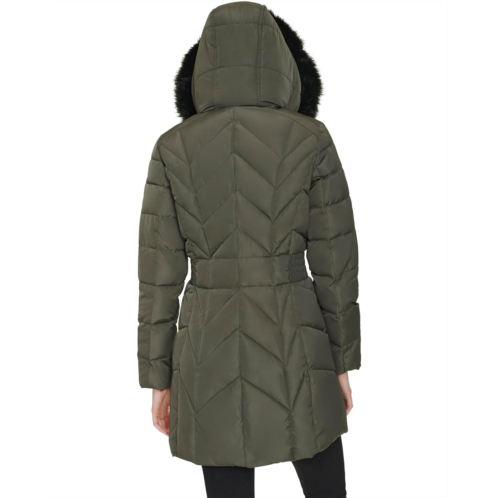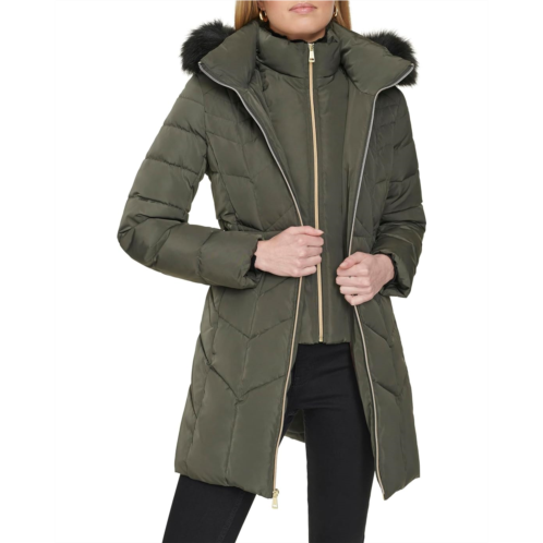 Snuggle up in superior warmth and comfort wearing the Cole Haan Taffeta Down Coat. Featuring a hood with removable fur strip and chevron quilting pattern, it's both chic and functional. With on-seam pockets and elastic waist inserts, it offers convenience and a flattering fit. Fully lined for warmth, it's your go-to coat for cold weather comfort.