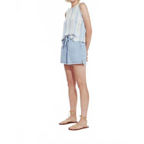 Tuck your favorite tee into these high-waist shorts for a more casual-cool feel.Elevate your summer wardrobe with the Anderson Shorts by MELISSA NEPTON, crafted in a chic chambray denim. These high-waist shorts feature a pull-on closure and an adjustable drawstring, ensuring a comfortable fit. The solid pattern and delicate eyelet hem detail add a touch of minimalist sophistication, making them ideal for vacation or casual outings. Stay stylish and relaxed with this perfect blend of refined design and all-day wearability.