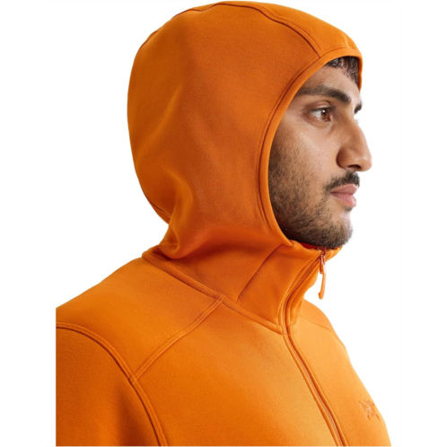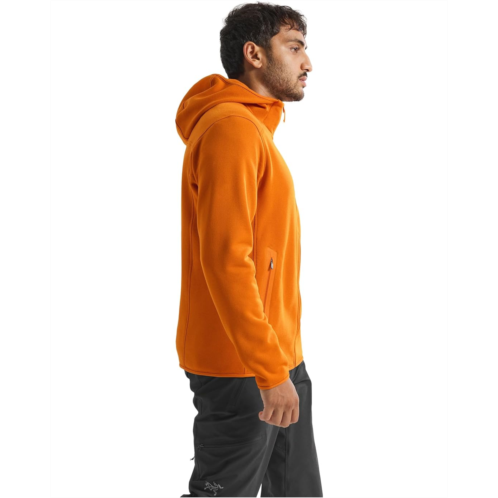 - Warm, versatile stretch fleece hoody that wears as a midlayer or on its own. Featuring a low profile hood, front zipper closure, long sleeves, front zipper hand pockets, and a straight hemline.