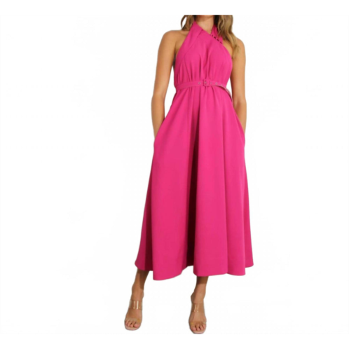 Just add slides or mules and you are good to go.The Icon Halter Dress by Mulla is a sophisticated choice, crafted from premium 100% polyester in a striking fuchsia hue. This sleeveless midi dress features a halter neckline with a button closure and a convenient back zipper for easy wear. Complete with a full lining and an included belt, it enhances your silhouette and provides a hint of elegance. Care instructions - Machine wash. Perfect for making a statement at weddings, graduations, and other special occasions.