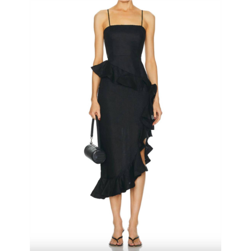 A cool twist on a classic style dress.Embrace elegance with the Zimmermann Harmony Tango Dress in Black, featuring spaghetti straps and a flattering squareneck. Crafted from 100% linen, this midi-length dress showcases a fitted bodice reinforced with side seam boning and exquisite ruffles throughout. The fit and flare silhouette adds to its appeal, making it perfect for summer evening events. Closure - Center back zip closure. Care - Dry clean only.