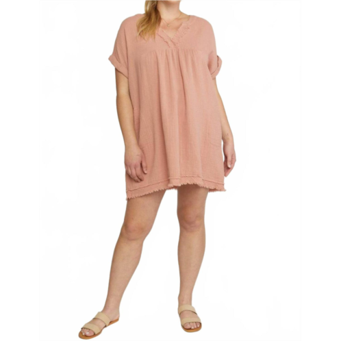 Comfortable and cute, this casual day dress has it all.Introducing the Frayed Cotton Gauze Pocket Dress by Entro, a perfect choice for a breezy and casual summer look. With its short folded sleeves and oversized A-line silhouette, this dress comes in a delightful salmon color. Made from 100% pre-washed cotton gauze, it features a frayed V-neckline and practical side seam pockets for added convenience. Dimension specifications - XL Bust 52', Length 35'; 1X Bust 54', Length 35'; 2X Bust 56', Length 35'. Closure - Pull-on. Care instructions - Hand wash or dry.