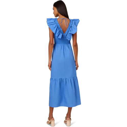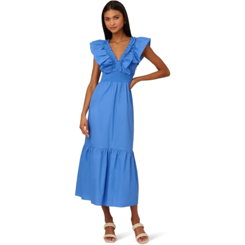 - Fun and ready for a day out, the Adrianna Papell Ruffle Front maxi dress is waiting for you. This dress features a V-neckline, sleeveless bodice, and ruffled details. Smocking from the neckline through the waist makes this maxi dress a perfect fit. Crafted from woven fabric, this dress is shirred from the waist through the flounce below the knee skirt.