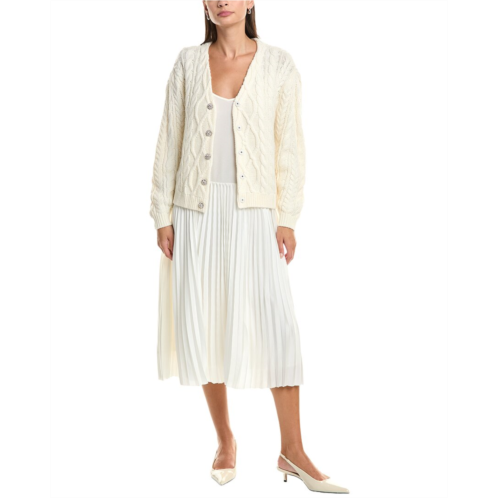 Introducing the luxurious 'Cinq a Sept Amandine Cardigan Wool-Blend Maxi Dress' from the renowned brand, Cinq a Sept. This stunning dress combines sophistication and ease, offering modern, feminine apparel for the fashion-forward woman. The Amandine Cardigan Wool-Blend Maxi Dress features a cable knit top, pleated skirt, and crystal embellishments in a timeless ivory color. With a button front closure and a blend of 70% acrylic and 30% wool, this dress is both stylish and comfortable. Made with 100% polyester combo, this dress is machine washable for easy care. Elevate your wardrobe with this elegant piece imported from Cinq a Sept.