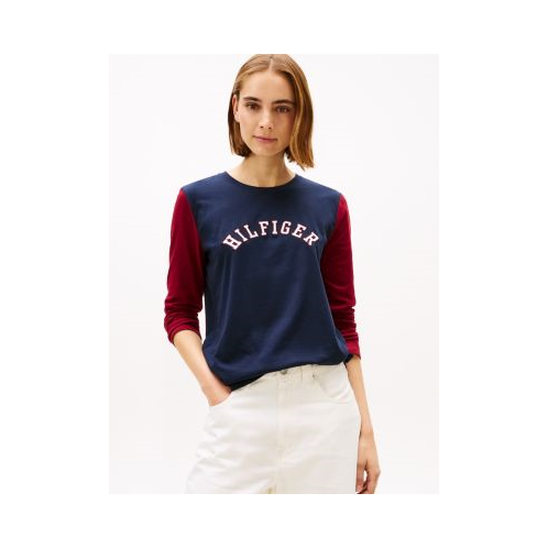 Tommy Hilfiger women's T-shirt. This long-sleeve tee is made from soft stretch-cotton jersey in an easy, comfortable fit. It's colorblock design and arched Hilfiger logo add a sporty touch.
