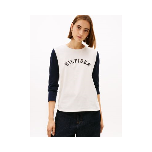 Tommy Hilfiger women's T-shirt. This long-sleeve tee is made from soft stretch-cotton jersey in an easy, comfortable fit. It's colorblock design and arched Hilfiger logo add a sporty touch.