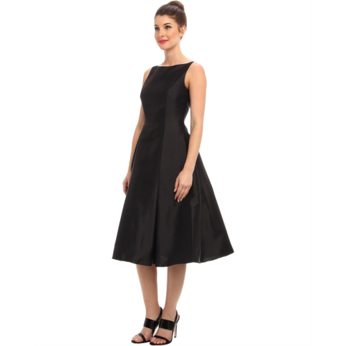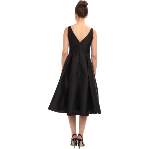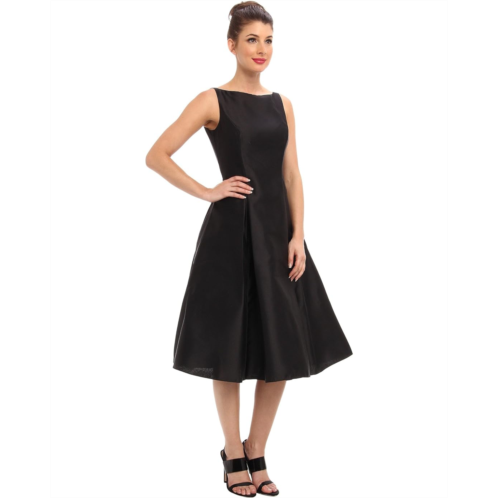 - Satin fit-and-flare dress features inverted pleats along the tea length skirt.
