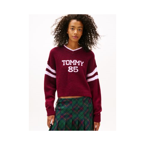 Tommy Hilfiger women's sweater. Made from a cozy acrylic and wool blend with a hint of stretch, our sweater is comfortable and soft to the touch. Designed with a relaxed fit, this piece is finished with a tipped V-neck, varsity stripes and an 85 varsity logo for a sporty feel. Part of our Tommy Jeans collection.