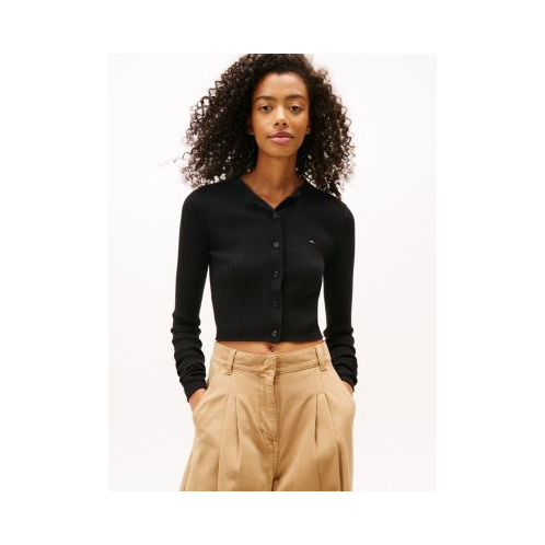 Tommy Hilfiger women's sweater. This cute cropped cardigan is designed in a trim fit with a soft ribbed texture. Made from fine-gauge combed cotton, this versatile layer keeps its shape and resists pilling. Part of our Tommy Jeans collection.