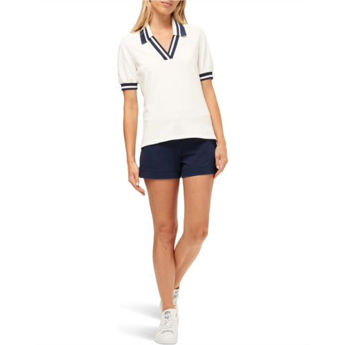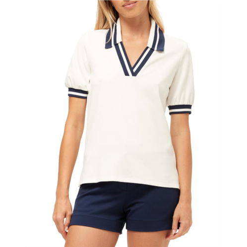 Showcase that flamboyant charm wearing the Trina Turk Set Point Top. It features a collared V-neckline with short puff sleeves and contrast trim detailing.