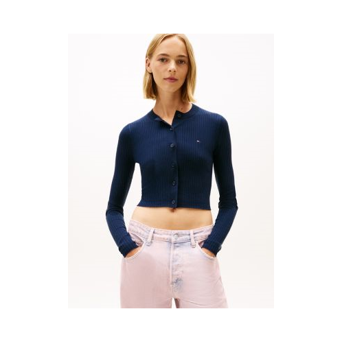 Tommy Hilfiger women's sweater. This cute cropped cardigan is designed in a trim fit with a soft ribbed texture. Made from fine-gauge combed cotton, this versatile layer keeps its shape and resists pilling. Part of our Tommy Jeans collection.