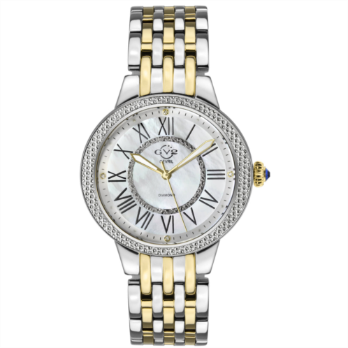 GV2 9145 Women's Astor II Swiss Diamond WatchGV2 Women's Swiss Watch from the Astor II Collection38mm 316L Stainless Steel Case with 50 Diamonds on BezelBrilliant White MOP Dial with Black Indices, 4 Single Cut Diamonds on DialPush Pull Fluted crown with Blue cabochon StoneTwo toned 316L Stainless Steel Yellow Gold Bracelet with Deployment BuckleAnti-reflective Sapphire CrystalWater Resistant to 30 Meters/3ATMSwiss Quartz Movement Ronda 763