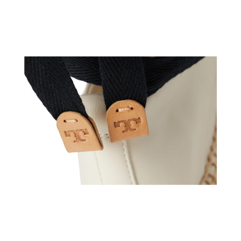 - Complement your chic warm weather style in the Tory Burch Cap-Toe Espadrille. Crafted from a leather upper, these shoes feature a round toe silhouette with laces in a tie closure, leather lining and insole, and a signature logo stud on the vamp.