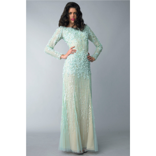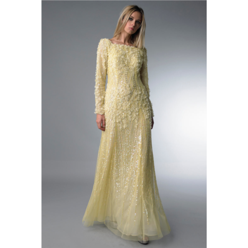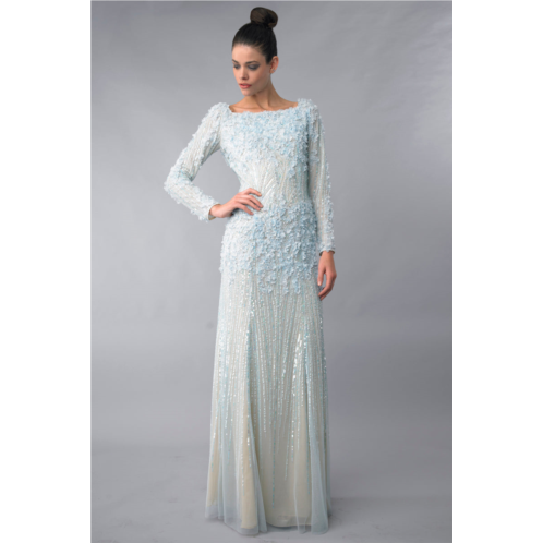 Long sleeve evening gown with a motif of laser cut flowers and sequins
