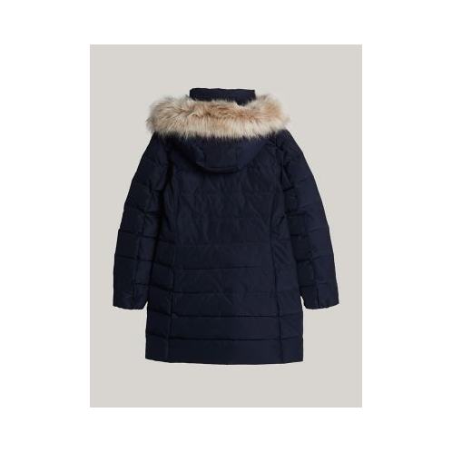 Tommy Hilfiger women's coat. This long coat that will keep you extra warm, thanks to the lightweight down insulation. The funnel neck and hood protects against chilly gusts, while faux fur trim adds a luxe feel. Part of our Adaptive Collection, designed for ease of dressing in classic Tommy style.