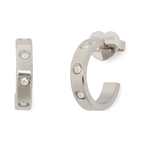 - Elevate your everyday look donning these stunning Kate Spade New York Huggie earrings. Crafted from brass and stainless steel, these earrings feature a sparkly glass stone and cubic zirconia material for a touch of glamor. With a post with snap down closure, these earrings are stylish and secure.