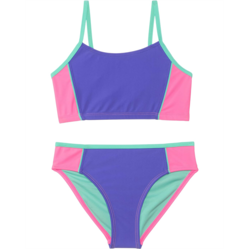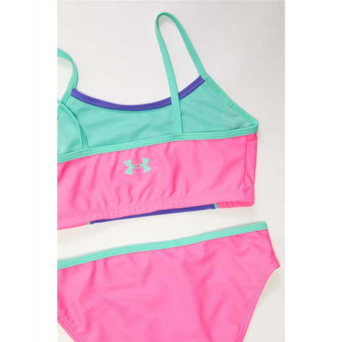- Get your little one ready for a day of fun in the sun choosing the Under Armour Kids Piping Color-Block swimsuit. Made from a lightweight and stretchy fabric, this swimsuit provides all-day comfort for your active child. The built-in UPF 30 sun protection will keep them safe from harmful rays while they splash around in the pool. The sports bra style bikini top features a stylish scoop neckline, spaghetti straps, a banded hem, and a cutout back for a trendy look. The bikini bottom is fully lined for extra coverage and features an elasticized waistband.
