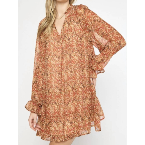 The kind of easy and flattering dress you'll be reaching for all season long.Introducing the Entro Print Long-sleeve Dress in a charming rust hue, ideal for a boho chic vacation look. This mini dress features a v-neckline and long sleeves with elastic at the wrists, ensuring comfort and style. Enjoy the added texture of a self-tie front and a fully lined interior for effortless wear. With a pull-on closure, this patterned patterned shift dress is perfect for summer adventures. Care instructions - Hand wash and line dry.