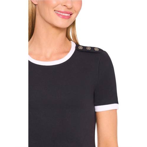 Timeless meets trendy, CeCe Crest Button Detail Baby Tee. Designed with a flattering classic fit, this short sleeve baby tee hugs in all the right places while keeping things cool and casual. The crew neckline is perfectly complemented by elegant crest button accents, giving this staple an upscale twist that works from brunch to boardroom. Crafted for easy wear with a pull-on design, this tee transitions seamlessly from jeans to skirts, layered looks to solo statements. It's soft, sleek, and subtly sophisticated-the kind of piece that makes getting dressed feel exciting again.