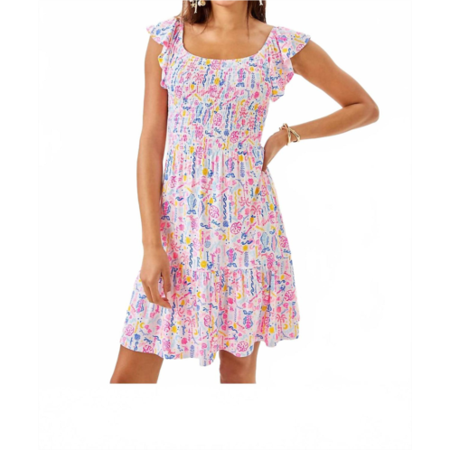 Comfortable and cute, this casual day dress has it all.Experience playful elegance with the Jilly Dress by Lilly Pulitzer, showcasing cap sleeves and a boho-chic, patterned design in a vibrant Summer Serenade hue. This women's casual dress features a flattering A-line silhouette with a smocked bodice and a charming hem ruffle. Made for vacation-ready style, it effortlessly pulls on for ease of wear. Care instructions not provided.