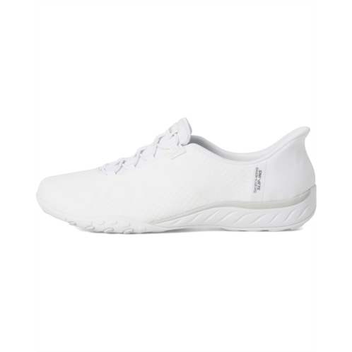 Simply step-in and go with comfort and style wearing the SKECHERS Breathe Easy - Knitty Waves Hands Free Slip-Ins. Designed with the exclusive Heel Pillow, this TOUCHLESS FIT style features a soft knit mesh upper and a cushioned Skechers Air-Cooled Memory Foam insole. Featuring round toe, bungee lace detailing, No-Tie Fit, low-top silhouette, and brand detailing on the footbed.