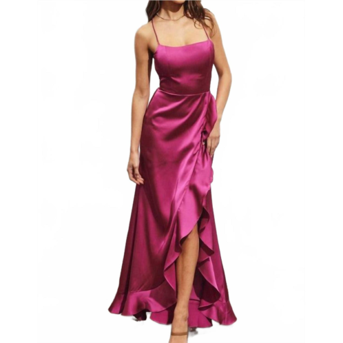 [US] DRESS FORUM sexy satin ruched high split maxi dress in fuschia