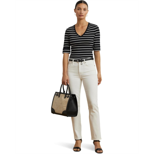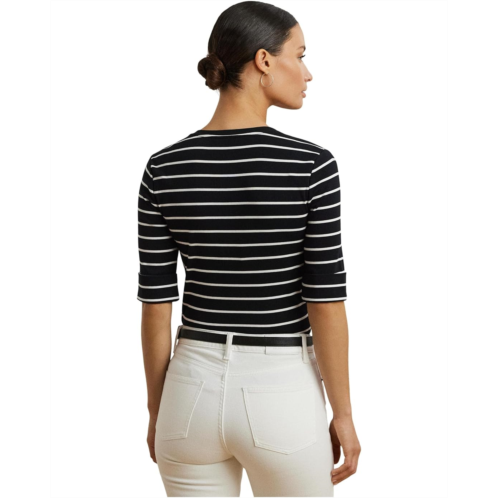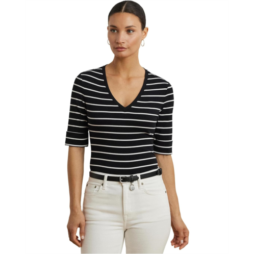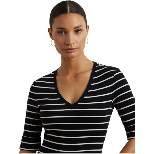 A timeless essential, this Lauren Ralph Lauren Striped Cotton Elbow-sleeve V-neck Tee is made with breathable stretch cotton for a soft hand feel. Lauren's signature embroidered logo on the hem completes the look. It features a V-neckline, elbow-length sleeves with folded cuffs, a striped pattern, and a side-split hem.