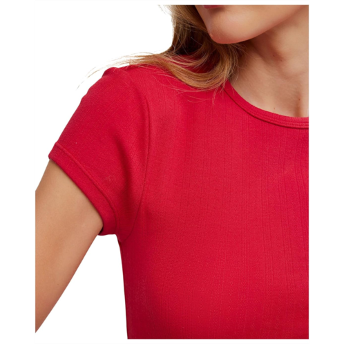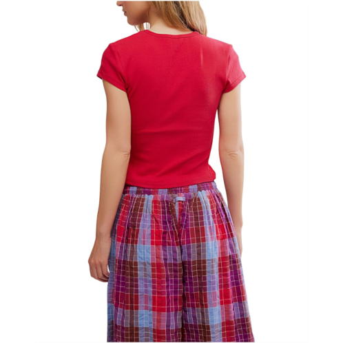 The Free People Wait A Minute Baby Tee blends feminine charm with everyday comfort. Crafted from soft, light fabric, this fitted tee offers a flattering silhouette. With short sleeves, this piece is perfect for layering or wearing solo for an elegant, understated look.