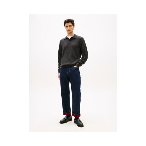 Tommy Hilfiger men's jean. Made from a recycled cotton blend with added stretch for movement, these jeans are designed in a loose fit with a straight-cut leg. Turn up the cuffs to show off the brushed flannel lining in a seasonal plaid print.