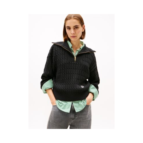 Tommy Hilfiger women's sweater. Soft and durable, this cable knit sweater is made from fine-gauge combed cotton that keeps its shape and resists pilling. It's finished with a quarter-zip placket that can adjust to a funnel neck for more coverage.