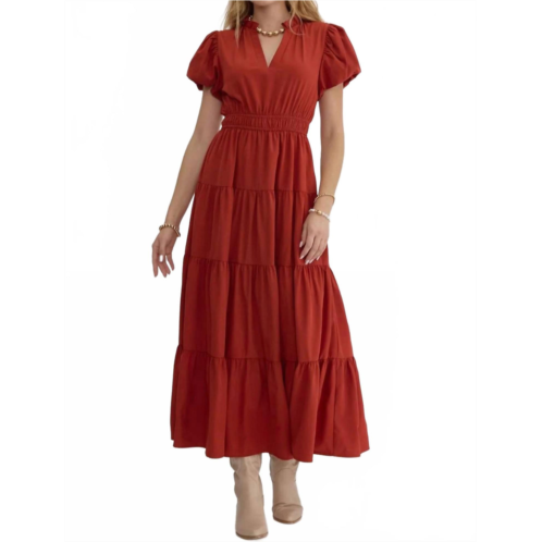 The perfect length dress does exist.Meet the Puff Sleeve Maxi Dress by Entro, a stylish addition to your summer wardrobe in a vibrant rust hue. This women’s dress features short bubble sleeves, a V-neckline, and a captivating tiered fit and flare silhouette. Crafted with a pull-on closure for ease, the elastic waistband offers comfort, while the lined non-sheer fabric promises a perfect fit for vacation outings. Care instructions include hand washing and line drying to maintain its minimalist charm.