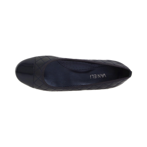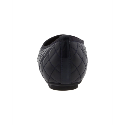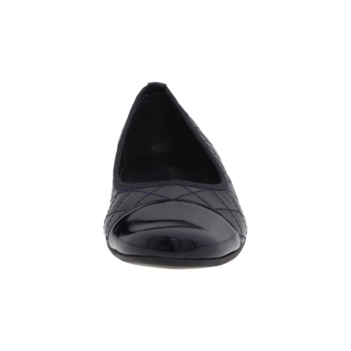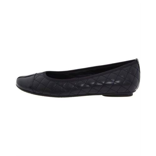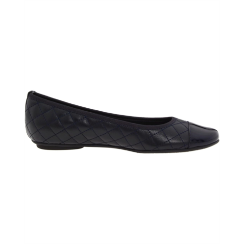 - Quilted leather skimmer flat with matching rolled elastic topline and contrasting leather or coordinating patent leather cap toe. Softly padded insole and arch support. One-piece flexible rubber sole and flat heel.