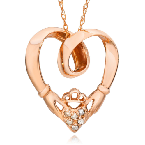 This unique and fancy womens heart shaped Claddagh pendant features six round brilliant cut natural diamonds. All diamonds are pave set in solid 14k rose gold. An 18' 14k rose gold clasp lock chain is included. 1/20ct total diamond weight.